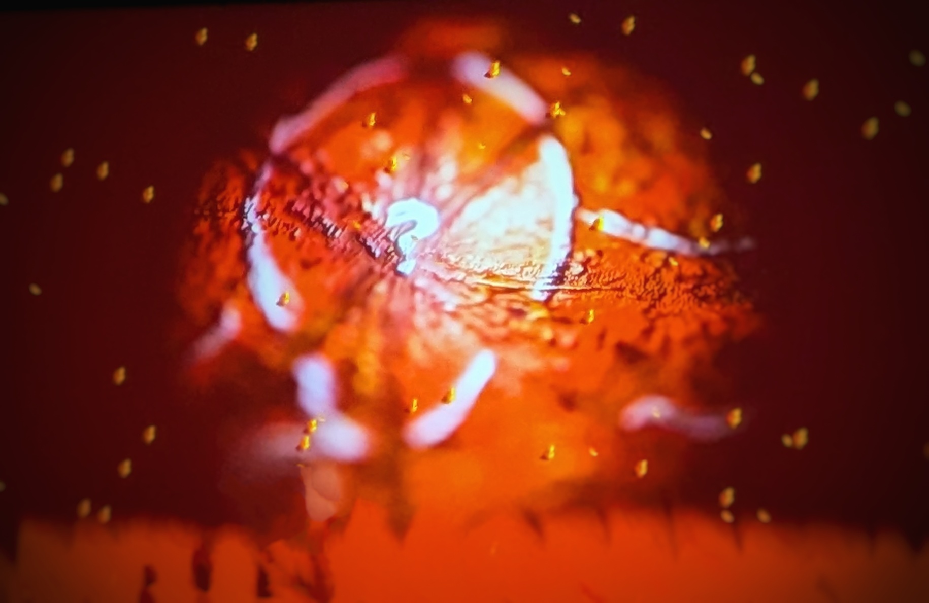 La instalación lúdica (de Cap Comentari) con esa imagen de un mundo casi subatómico de fuego y signo de pregunta (interrogante y posibilidad) me remitió, en contraposición, al profundo lago helado del infierno de Dante (en la Divina Comedia)