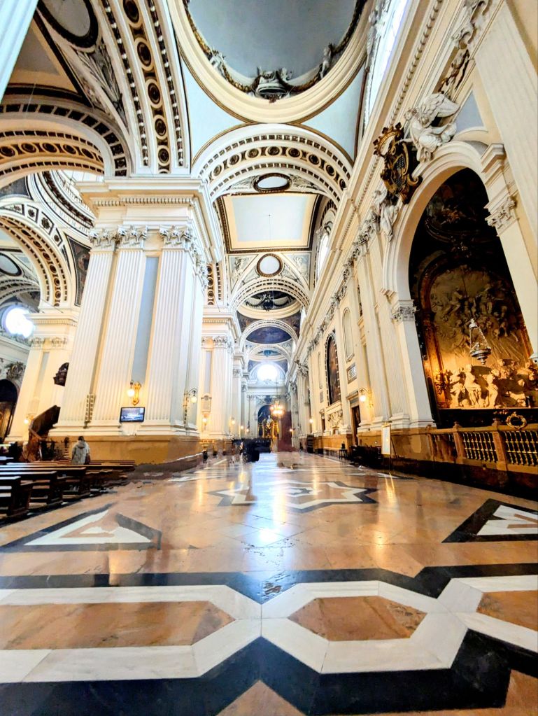 Tiene un estilo barroco, rococó, neoclásico y la plaza peatonal más grande de Europa después de la plaza Roja de Moscú.