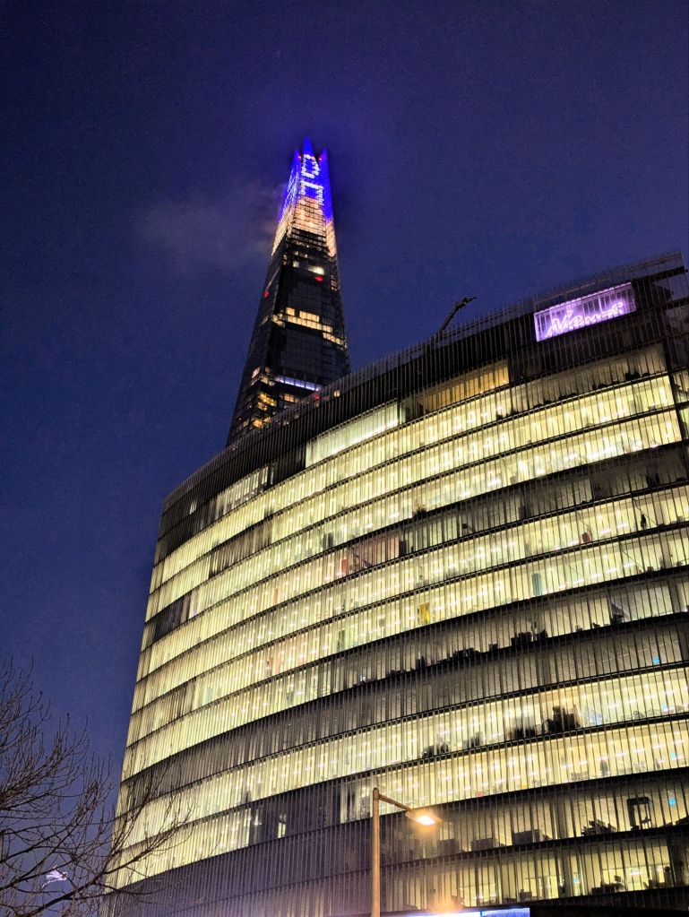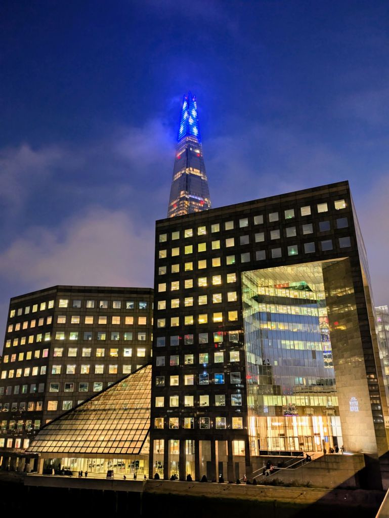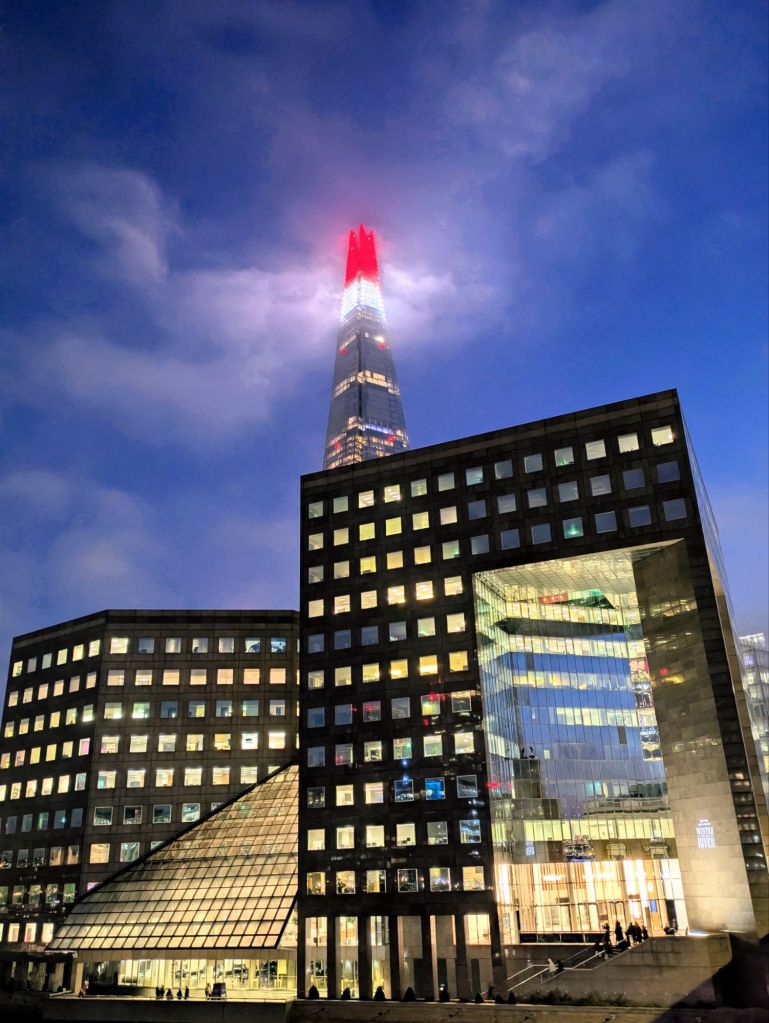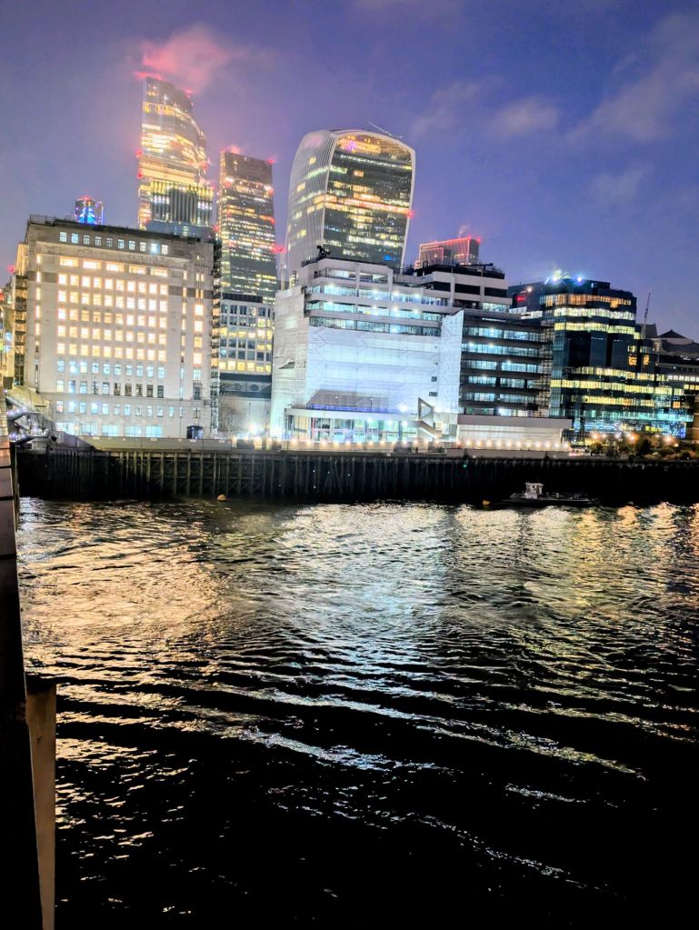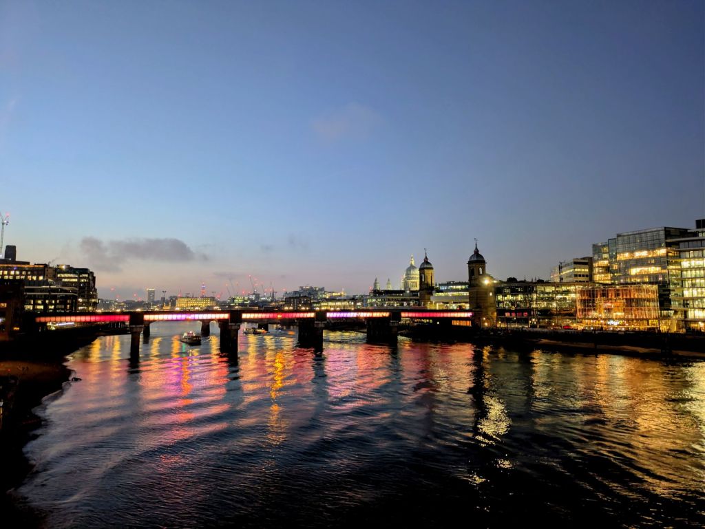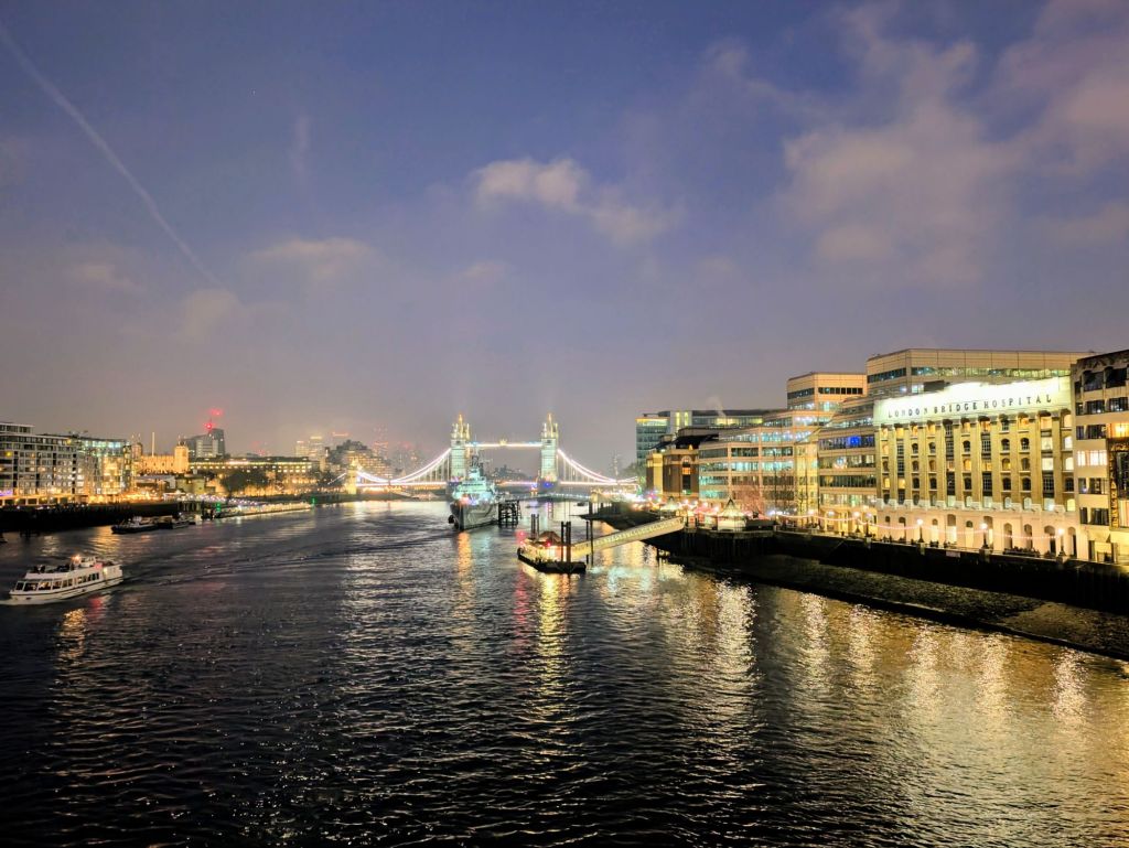 Anochece en Londres. Es la Noche Vieja de 2025. Espero captar la atmósfera, bella e inquietante, casi surrealista, de las ultimas luces de la tarde sobre el puente de Londres.